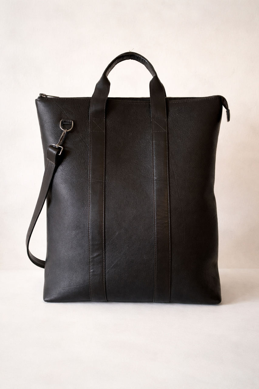 A timeless classic, our tote bag comes in chocolate brown or black leather.